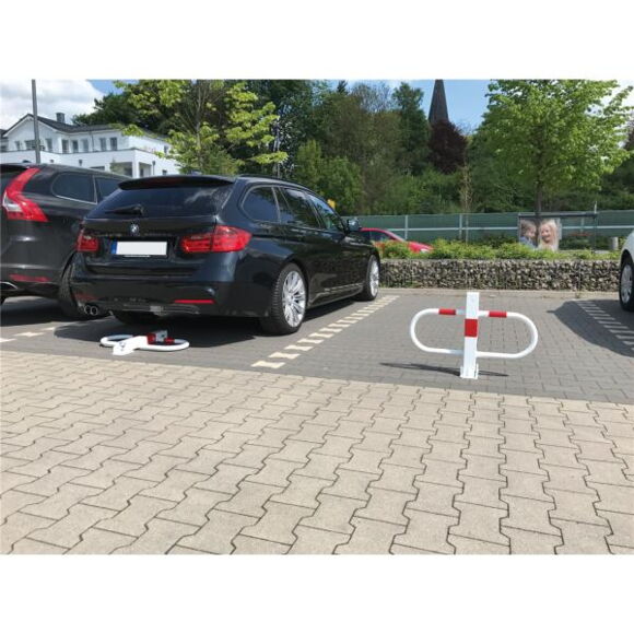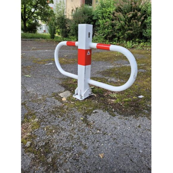 Блокатор паркувального місця, що складається, квадратна труба 70 x 70 мм, з бічними круглими трубчастими обручами та цільною базовою пластиною загальною шириною 800 мм, висотою 500 мм. З європрофільним циліндричним замком