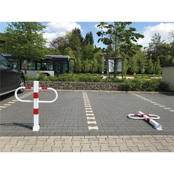 Блокатор паркувального місця, квадратна труба 70 x 70 мм, з бічними круглими трубчастими обручами та цільною базовою пластиною ширина 800 мм, що складається, з трикутним запірним механізмом згідно з DIN 3223, з/із засувкою, що самозамикається, фіксується гвинтами з/із опорною плитою або з/із ґрунтовою втулкою каталожний номер 470.60