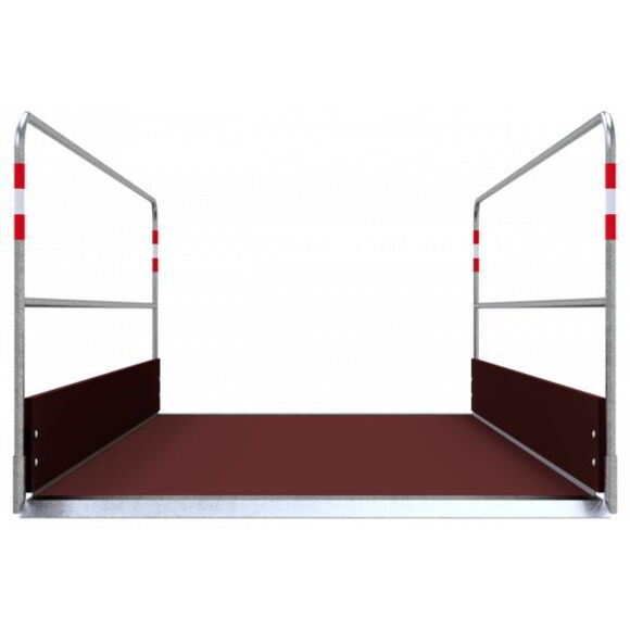 Дерев´яний траншейний міст, для безпечного перетину канав і каналів, рама з оцинкованої сталі, з пандусом для переміщення колясками, дерев’яне покриття та плінтус із суцільнодерев’яної панелі з кількома покриттями. Протиковзке покриття, стійке до атмосферних впливів просочення забезпечує тривалий термін служби, боковини оснащені світловідбиваючими смугами червоні/білі. Обидва поручні можна зняти для економії місця при транспортуванні та зберіганні. Цей міст відповідає нормам постанови ZTV-SA, навантаження: 150 кг/м2