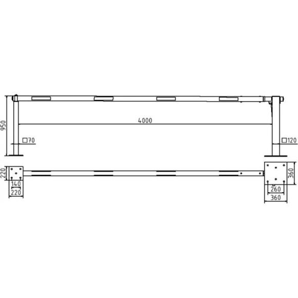 Основна опора: квадратна сталева труба 120 x 80 мм з пластиною 360 x 360 x 8 мм , включаючи 4 отвори Ø 20 мм для анкерів, оцинкована та з порошковим покриттям червоного кольору, шлагбаум може бути зафіксований у відкритому та закритому положенні